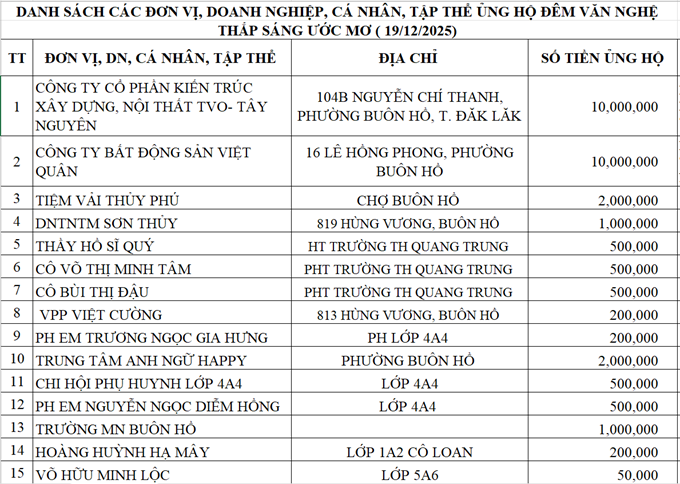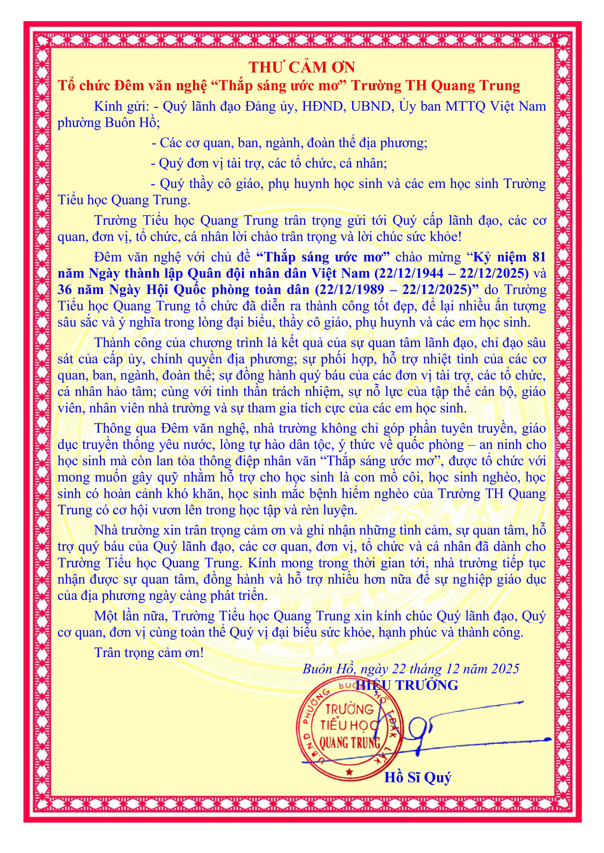 Sau thành công của đêm văn nghệ “Thắp sáng ước mơ” diễn ra vào tối 19/12/2025, Trường Tiểu học Quang Trung – phường Buôn Hồ xin được bày tỏ lòng tri ân sâu sắc tới các mạnh thường quân, quý phụ huynh, quý khán giả, tập thể cán bộ, giáo viên, nhân viên nhà trường và sự tham gia tích cực của các em học sinh thân yêu đã quan tâm, ủng hộ và đồng hành cùng nhà trường trong hoạt động ý nghĩa này.